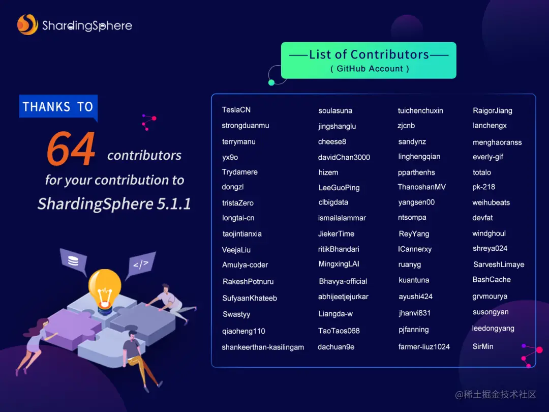 此次 Apache ShardingSphere 5.1.1 版本的发布,共有 64 位 Contributor 提交了 698 个 PR,感谢社区伙伴们的大力支持。