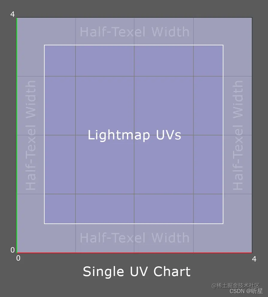 这个最小尺寸使 Unity 能够将图表(Charts)拼接在一起,以实现跨几何边缘的无缝照明。 Unity 需要沿图表(Charts)边缘至少有 4 个纹素,以便在找到并缝合相应的伙伴之前唯一标识它。