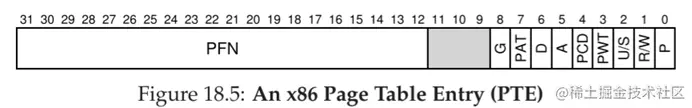 那么page table中存储着什么呢?以一个x86系统的page table为例,32位长度的page table占最多的是PFN,通过PFN可以直接映射到物理内存的某一个page上。此外还有一些用于其它功能的bit位,例如protection bit、present bit、dirty bit、reference bit、accessed bit、read/write bit等。