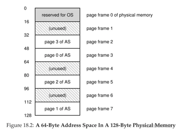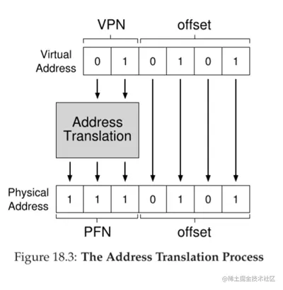 在这种架构下如何将进程的地址空间访问转化为物理内存的访问?操作系统为每一个进程都提供了一个数据结构称为page table,用来存储每一个进程由地址空间到物理地址的address translation。这种情况下,进程发出的每一个虚拟地址都不是单独的地址大小(偏移量),而是包含了至少两部分,即virtual page number (VPN)和offset,offset的概念上一节已经提到过了。我们举例一个大小为64 bytes的address space,每一个page是16 bytes,那么地址空间总共就有4个page,因此这个进程的虚拟地址总长是6 bit,其中2 bit是VPN,意思是属于哪一个page,例如01表示第一个page,4 bit是offset。