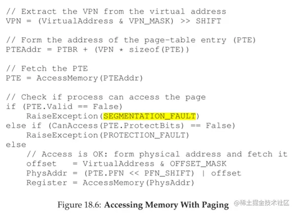 下图是page table工作流程的伪代码。比较详细的介绍了page table如何将虚拟地址转化为物理地址的整个过程。