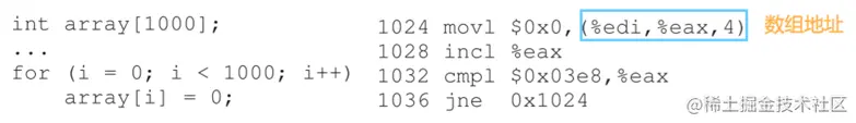 C程序很简单,循环赋值一个长度为1000的数组,右边是它的二进制码编译而来的机器语言。