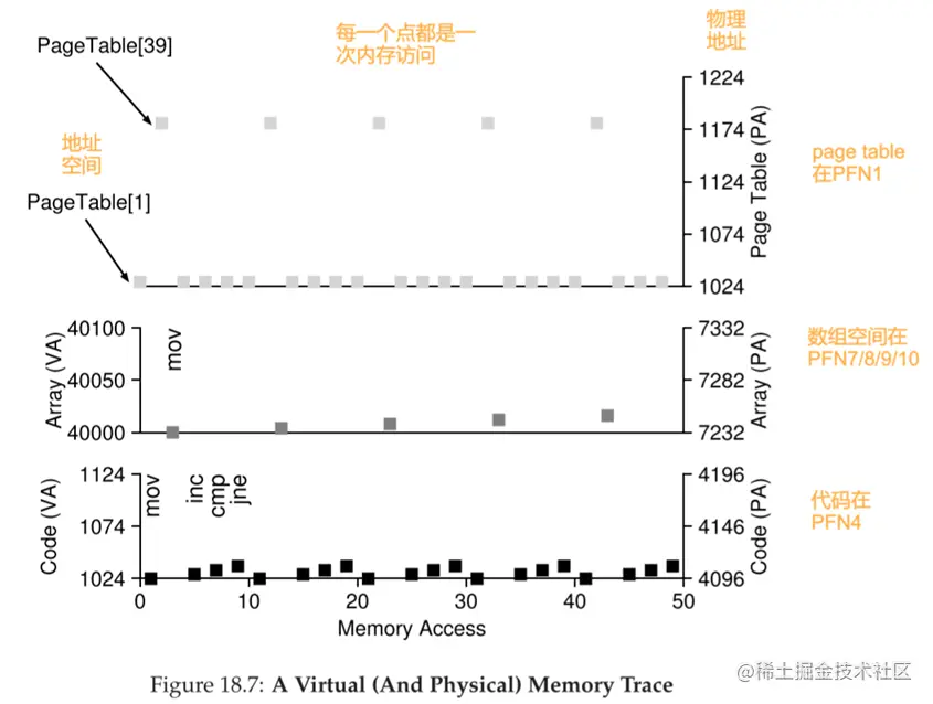 此处如果我们假设地址空间中的4个page都已经分配了,那么page table中就会存储有4个physical address