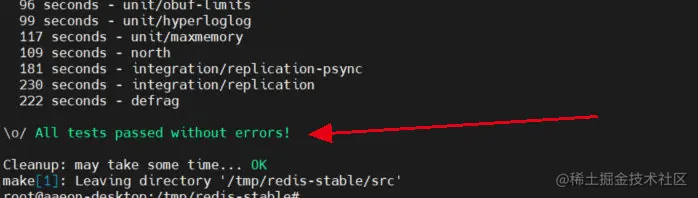 测试的过程可能花费的时间会很长,耐心等待之后如果出现“\o/ All tests passed without errors!”的字样,则说明Redis编译安装成功。