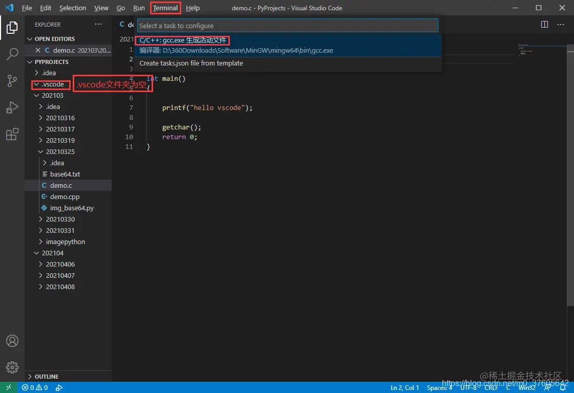 选择 【Terminal】 -> 【configure task】 -> 【C/C++:gcc.exe生成活动文件】