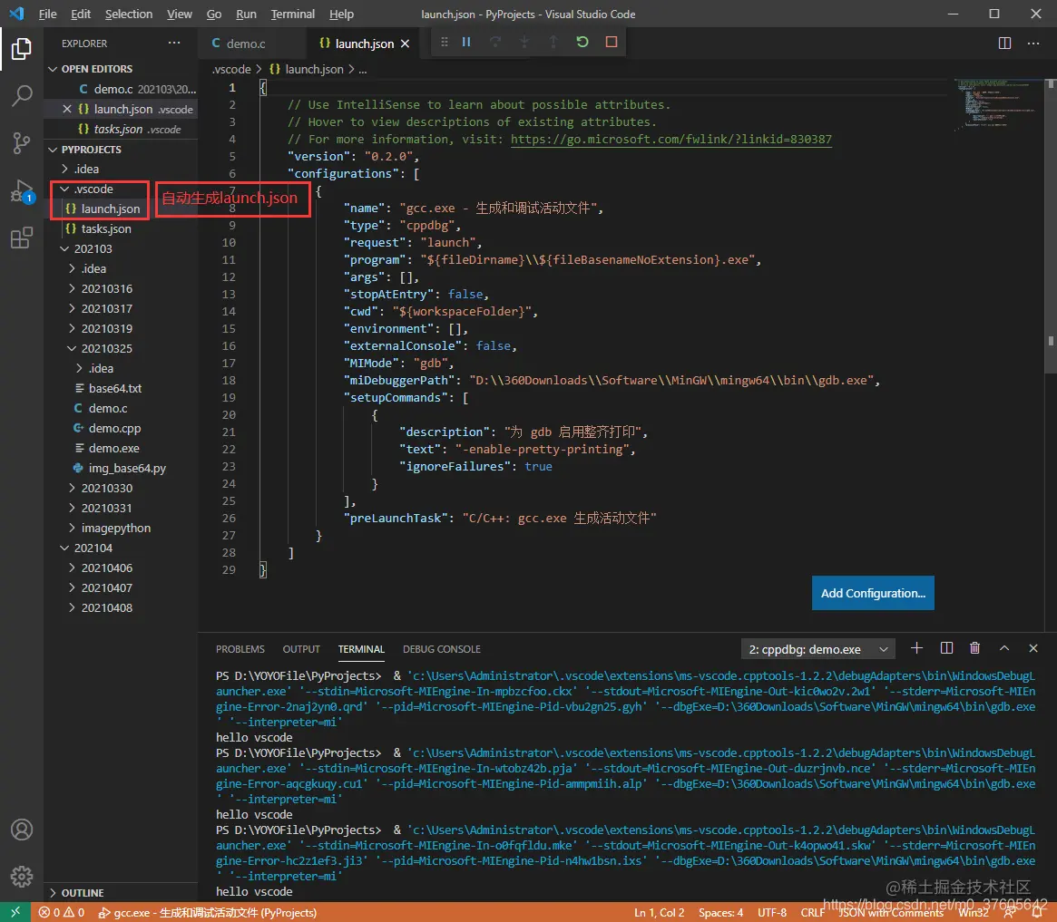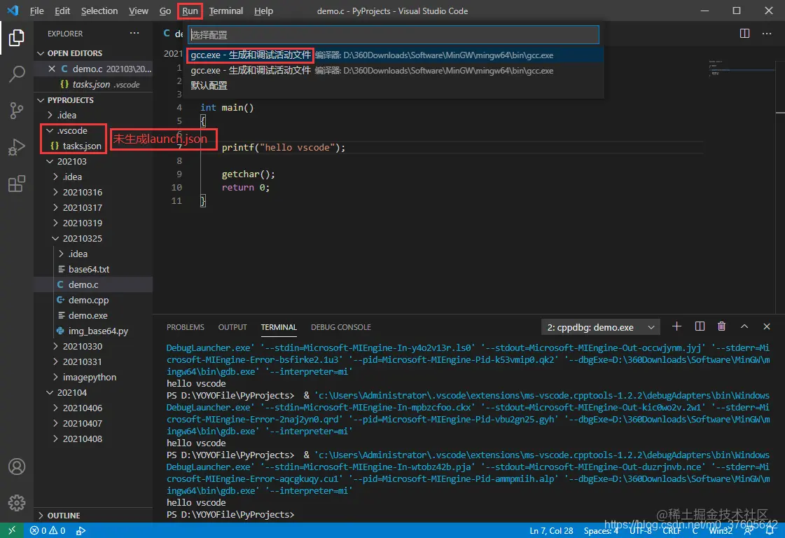 - 生成task.json和launch.json文件之前,务必切换到demo.cpp或者demo.c文件,否则自动生成的task.json和launch.json无法编译对应的demo.cpp和demo.c