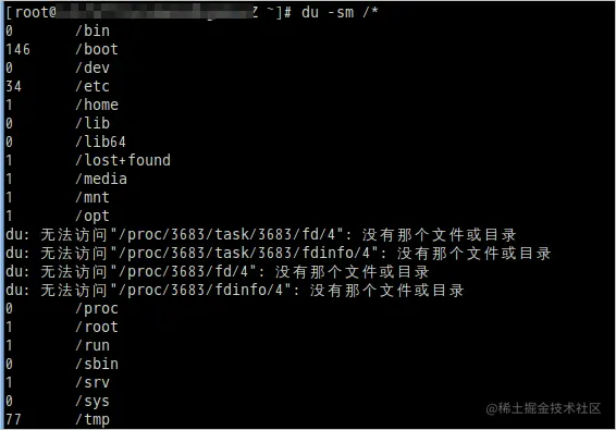 执行如下命令,列出根目录底下每个目录所占用的容量,并以MBytes单位显示容量。