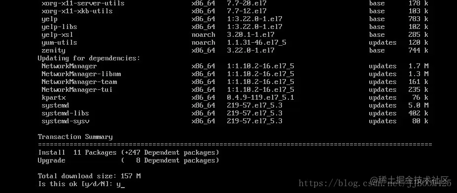 重启后在命令行中输入 yum groupinstall “X Window System” ,中间遇到选择都输入 y,如下图: