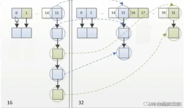 当数组长度从16到32,其实只是多了一个bit位的运算,我们只需要在意那个多出来的bit为是0还是1,是0的话索引不变,是1的话索引变为当前索引值+扩容的长度,比如5变成5+16=21