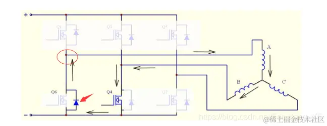 至于为什么这么大反向电压在相电压处没有检测出来,如下图,被箭头上的续流二极管钳住了,椭圆处的电压比地小0.7v,这是上管关闭的情况;当下管关闭时候,从B线圈出来的电流将通过上管流向电源电压,所以B相电压此时是电源电压+0.7v;虽然被钳到0.7v,但是如果线电阻和mos电阻过大,造成二极管两端电压过大,击穿二极管