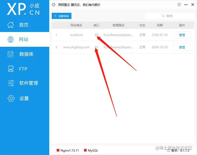 点击右侧的【网站】添加一个新的网站域名,这个域名是本地的域名,可以是任意的字符串,但是需要注意,如果自己创建了多个网站服务,端口号不能重复,否则会访问不到服务。