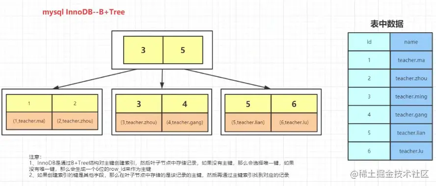 InnoDB是通过B+Tree结构对主键创建索引,然后叶子节点存储记录,如果该表没有主键,那么会选唯一键当成创建索引的”主键“;如果没有唯一键,那么会生产一个6位的row_id来作为创建索引的”主键“。- 如果创建索引的键是表中的其他字段,那么在叶子节点中存储的数据是该条记录的主键而不是整条记录的数据,然后再通过主键索引找到对应的记录。