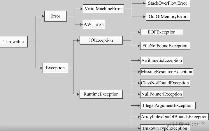 从图中可以看出所有异常类型都是内置类 Throwable 的子类,因而 Throwable 在异常类的层次结构的顶层。