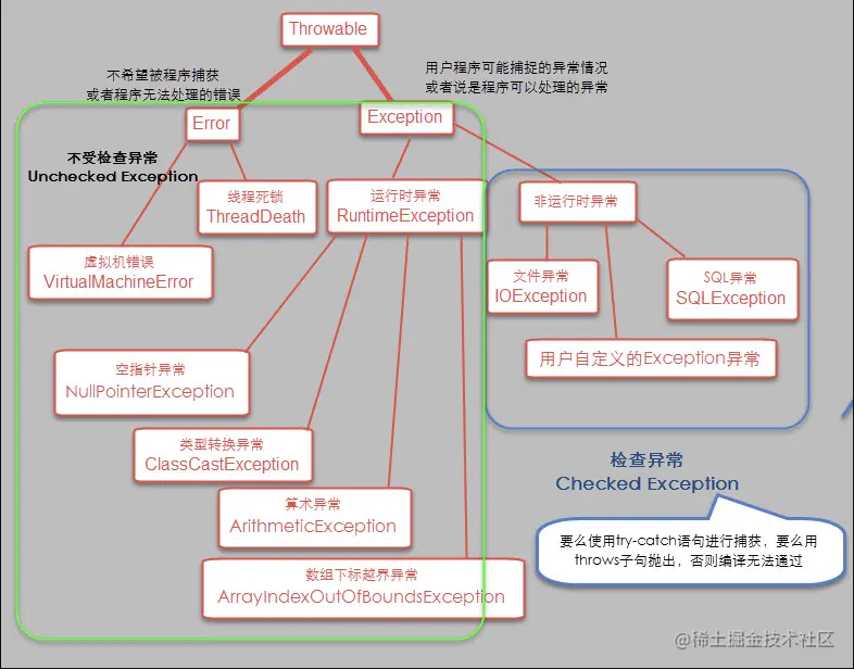 - 对于方法运行中可能出现的错误Error ,当运行方法不欲捕捉时,Java允许该方法不做任何抛出声明。因为,大多数Error 异常属于永远不能被允许发生的状况,也属于合理的应用程序不该捕捉的异常。