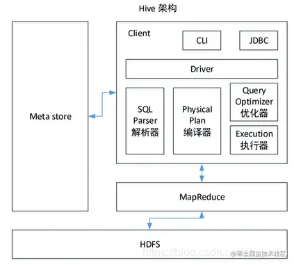 1.用户接口:Client CLI(hive shell)、JDBC/ODBC(java 访问 hive)、WEBUI(浏览器访问 hive)。