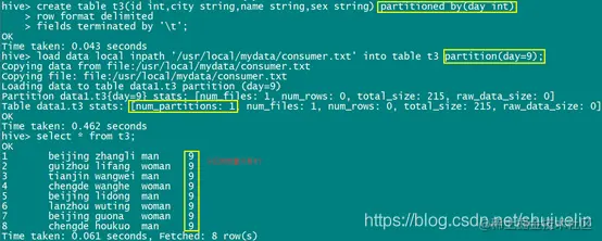 load data local inpath ‘/usr/local/consumer.txt’ into table t1 partition (day=2);