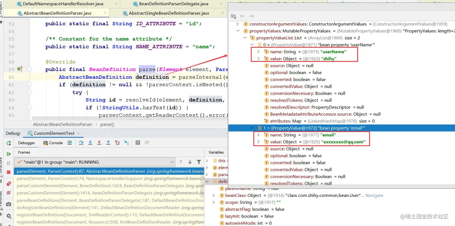 <myname:user id="testbean" userName="shihy" email="xxxxxxxx@qq.com"/>中的各个属性取出来放入到BeanDefinitionBuilder中,后续会建造出一个bean定义对象AbstractBeanDefinition。后续容器就根据这个bean定义对象进行bean的实例化操作。