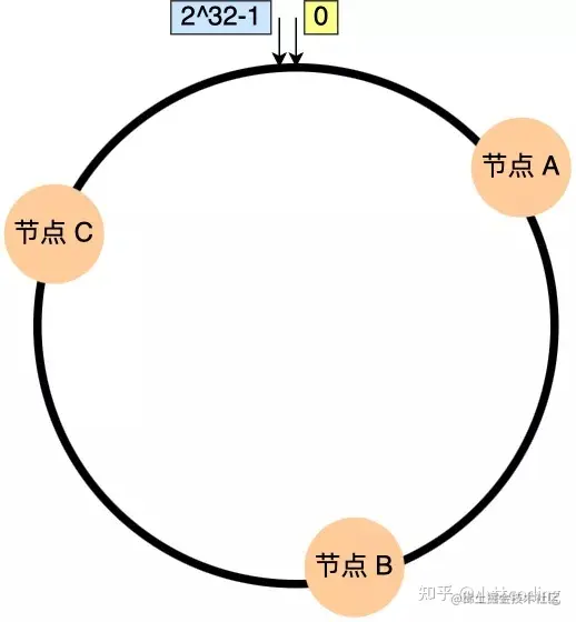 举个例子,有 3 个节点经过哈希计算,映射到了如下图的位置: