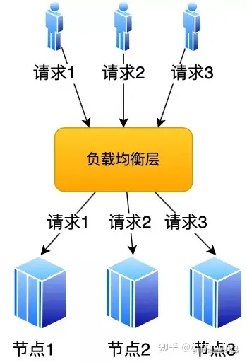 最简单的方式,引入一个中间的负载均衡层,让它将外界的请求「轮流」的转发给内部的集群。比如集群有 3 个节点,外界请求有 3 个,那么每个节点都会处理 1 个请求,达到了分配请求的目的。
