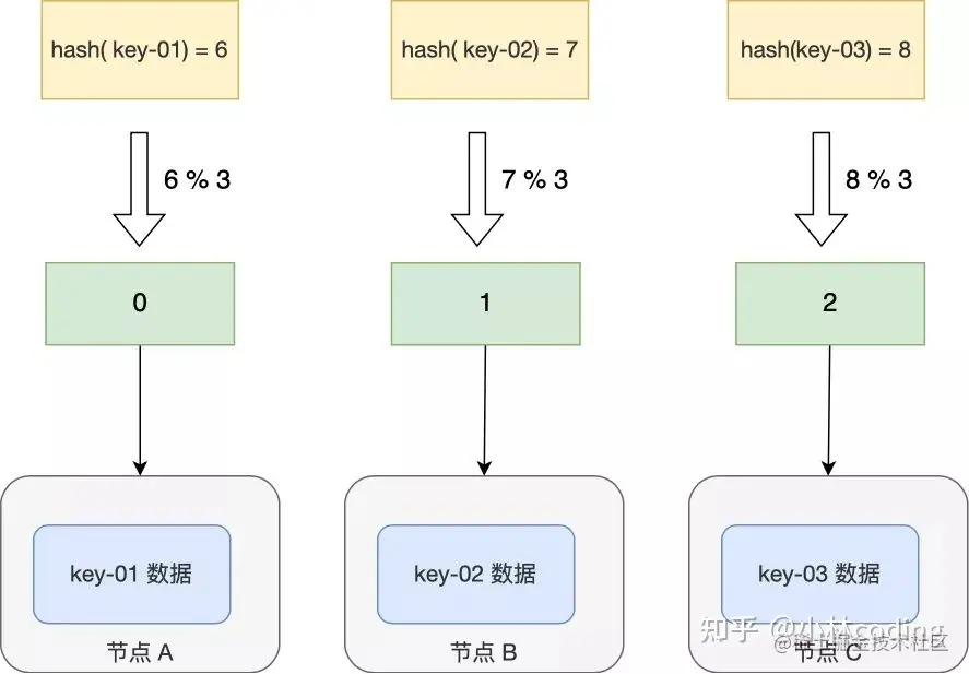 哈希算法最简单的做法就是进行取模运算,比如分布式系统中有 3 个节点,基于 hash(key) % 3 公式对数据进行了映射。