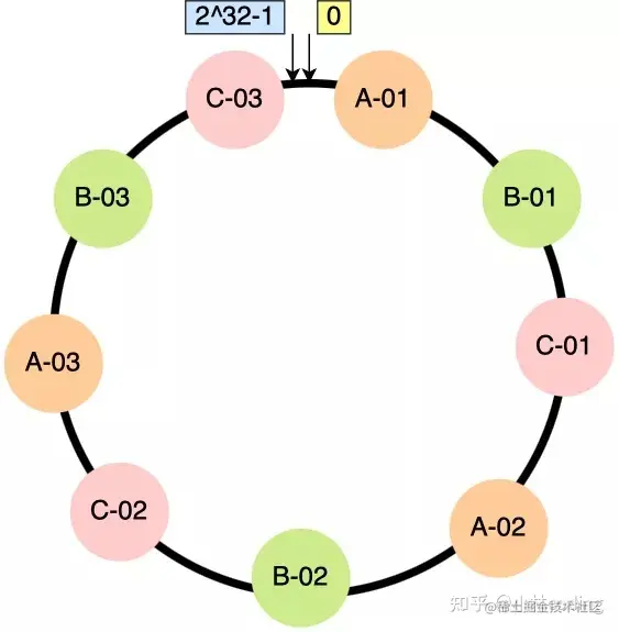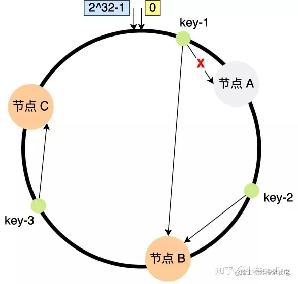 比如,下图中的 key-01 映射的位置,往顺时针的方向找到第一个节点就是节点 A。