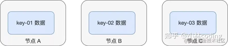 比如,之前的 hash(key-01) % 3 = 0,就变成了 hash(key-01) % 4 = 2,查询 key-01 数据时,寻址到了节点 C,而 key-01 的数据是存储在节点 A 上的,不是在节点 C,所以会查询不到数据。