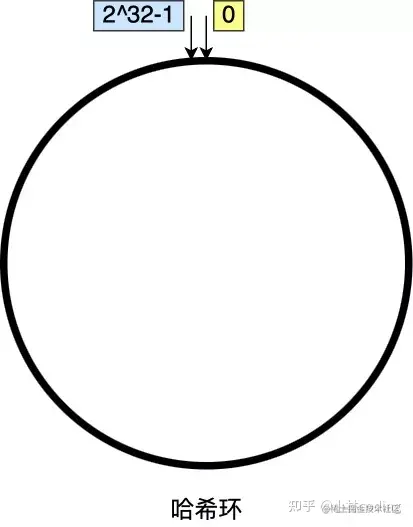 我们可以把一致哈希算法是对 2^32 进行取模运算的结果值组织成一个圆环,就像钟表一样,钟表的圆可以理解成由 60 个点组成的圆,而此处我们把这个圆想象成由 2^32 个点组成的圆,这个圆环被称为哈希环,如下图: