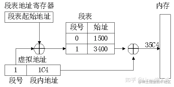 在段式 管理系统中,整个进程的地址空间是二维的,即其逻辑地址由段号和段内地址两部分组成。为了完成进程逻辑地址到物理地址的映射,处理器会查找内存中的段表,由段号得到段的首地址,加上段内地址,得到实际的物理地址。这个过程也是由处理器的硬件直接完成的,操作系统只需在进程切换时,将进程段表的首地址装入处理器的特定寄存器当中。这个寄存器一般被称作段表地址寄存器。