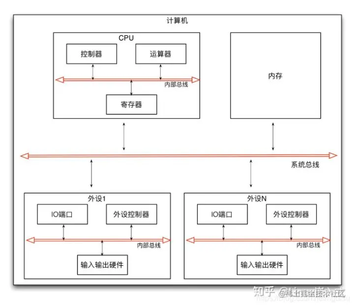计算机是一种数据处理设备,它由CPU和内存以及外部设备组成。CPU负责数据处理,内存负责存储,外部设备负责数据的输入和输出,它们之间通过总线连接在一起。CPU内部主要由控制器、运算器和寄存器组成。控制器负责指令的读取和调度,运算器负责指令的运算执行,寄存器负责数据的存储,它们之间通过CPU内的总线连接在一起。每个外部设备(例如:显示器、硬盘、键盘、鼠标、网卡等等)则是由外设控制器、I/O端口、和输入输出硬件组成。外设控制器负责设备的控制和操作,I/O端口负责数据的临时存储,输入输出硬件则负责具体的输入输出,它们间也通过外部设备内的总线连接在一起。