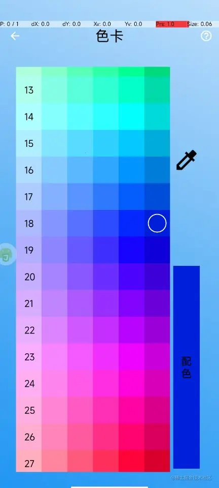 - 手指触摸某个颜色, 该颜色标记为选中态-画一个白色圆圈, 设计的时候, 理论应该只显示一个选中的颜色, 可是有时候显示了多个白色圆圈