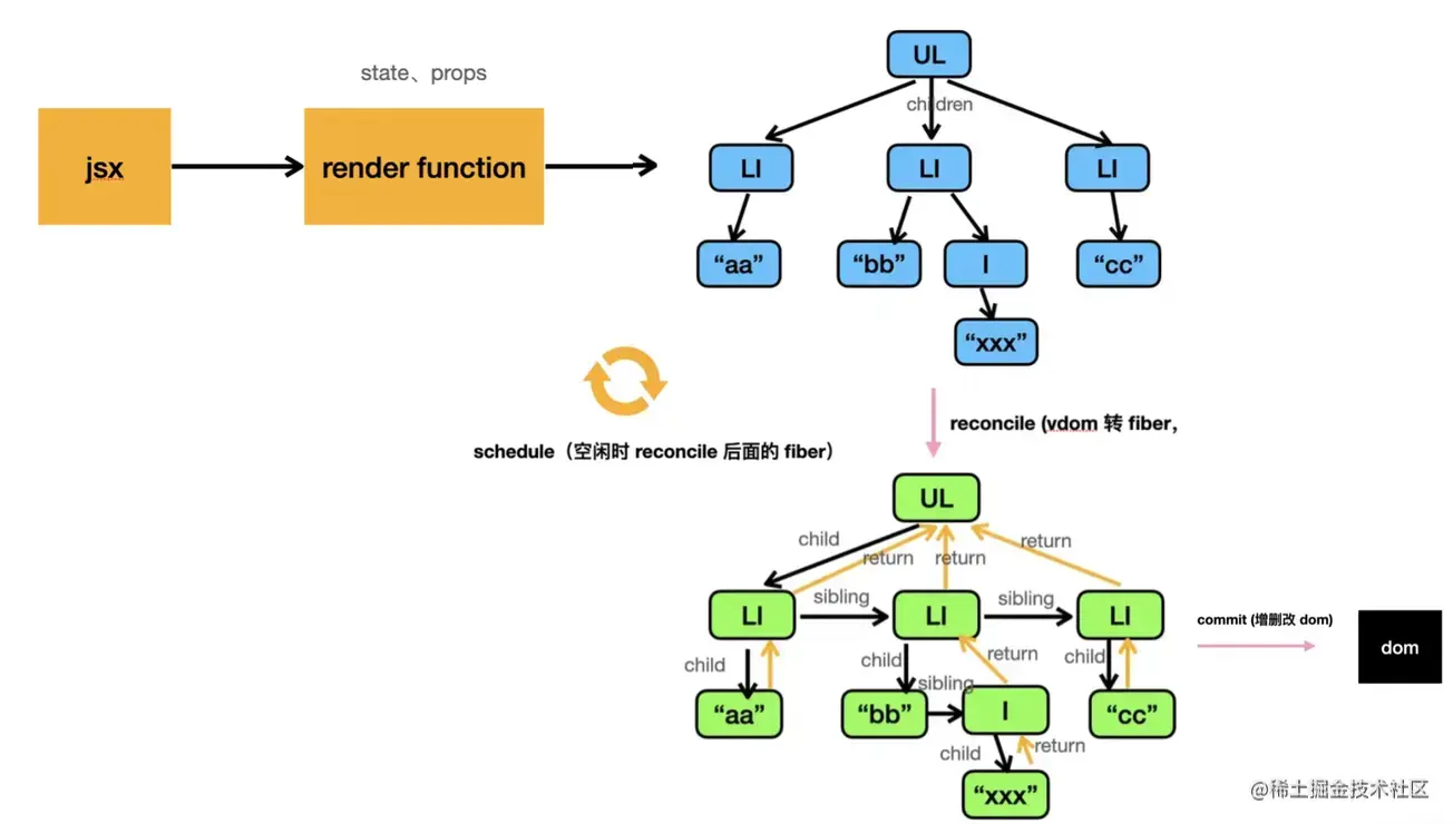 vdom 转 fiber 的过程叫做 reconcile,最后增删改真实 dom 的过程叫做 commit。