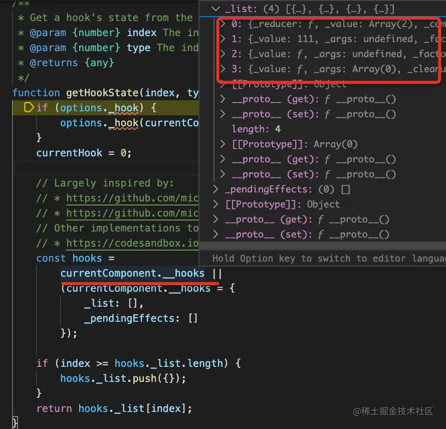 如图,它把 hooks 存在了 component.__hooks 的数组上,通过下标访问。
