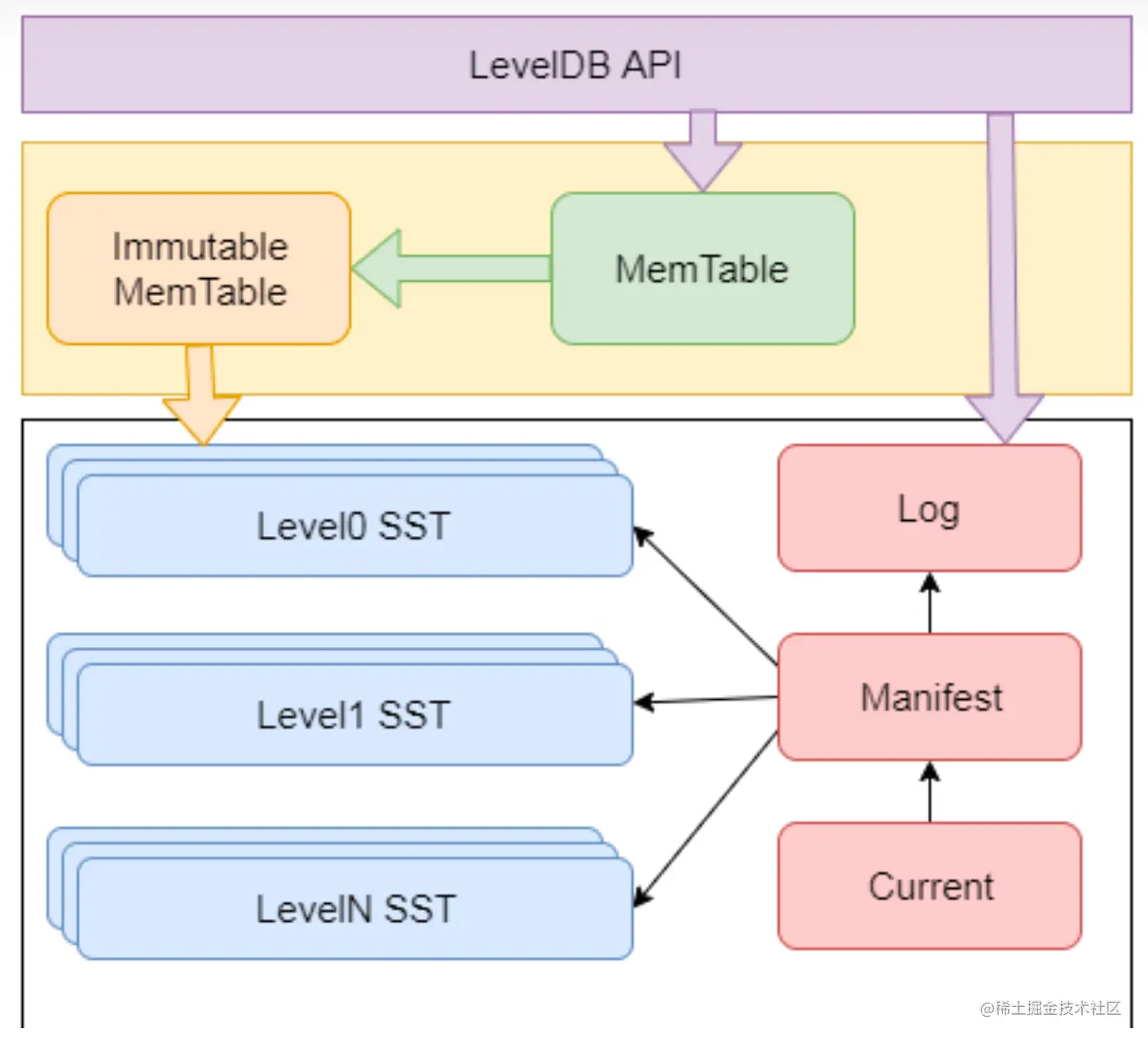 SST文件::磁盘数据存储文件,分为Level 0到Level N多层,每一层包含多个SST文件;单层SST文件总量随层次增加成倍增长。SST文件本身是不可被修改的,这是Level-DB 设计哲学的一环,通过追加的和定期合并文件的方式实现了“删除”的操作,同时在读取的时候通过特殊的标记来判断更新还是删除操作,借此保证获取到最新的数据,这些内容在源代码中都能很好的发现,在后续的文章中会详细的解释,这里只需要有个大概的概念即可。