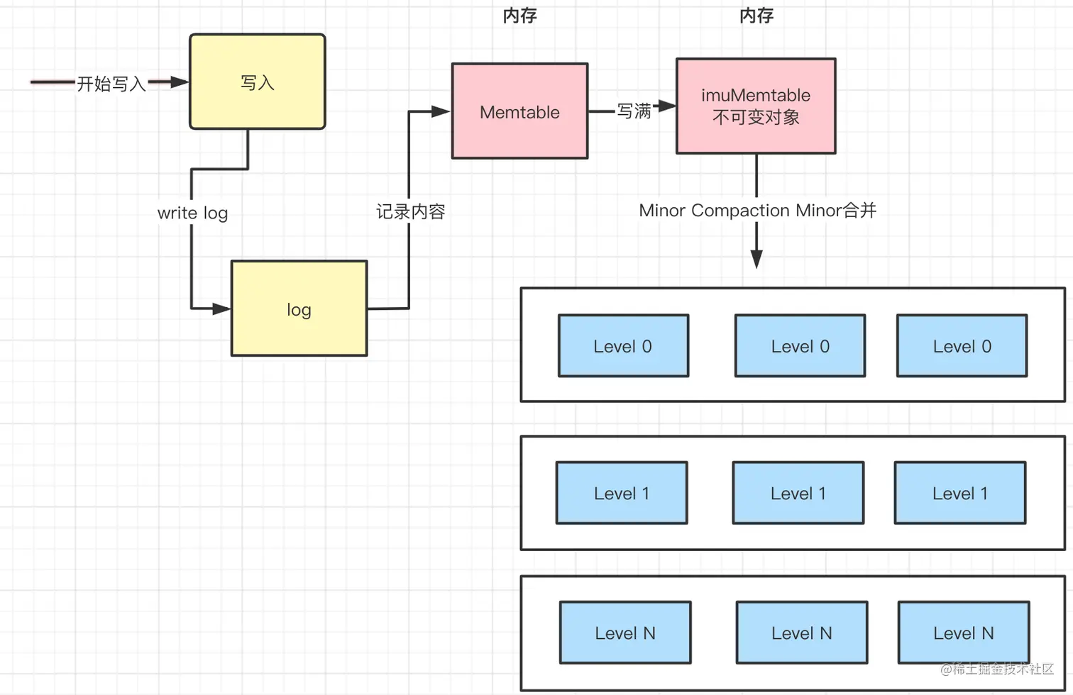 - Immutable Memtable:顾名思义不可变的内存数据结构,当内存数据结构数据满了之后就需要触发数据合并的操作,此时需要停掉数据读写并且对数据进行压缩。