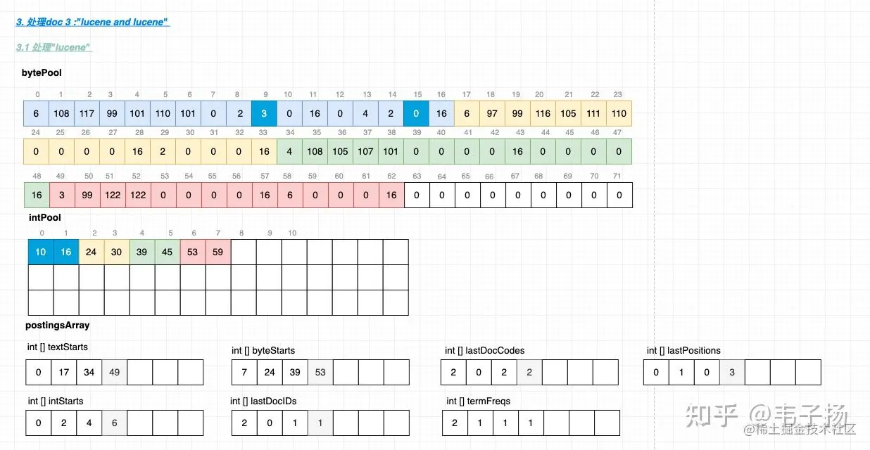 - "lucene"这个term再次出现了, 由于它的词频大于2, 所以在stream0 里先写入它的对应的 lastDocCodes 0, 代表这个term出现的上一个docID, 然后写入2, 代表该term的词频。 所以bytePool的7和8被分别更新成了0 和2 , 而IntPool的第0位也需要+2从7变成9, 代表下次从9写入。