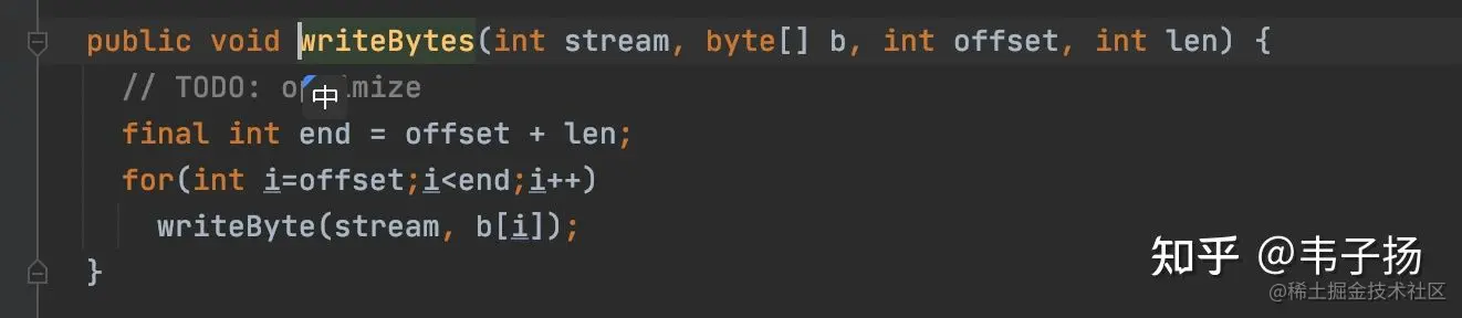 TermsHashPerField是干啥的我们现在不用很具体的知道,只要知道这个类负责具体写入倒排数据结构的类就可以了(而且真正写入的类并不是TermsHashPerField类,而是它的子类FreqProxTermsWriterPerField), 这个方法的意思大概就是,给定一个stream, 一个要写入的byte, 然后往blockPool里面去写入这个byte, 这里的stream我稍微解释一下, 我们写入倒排表的时候,其实不仅要写入这个term的位置,还要记录它的词频、 offset这些,打个比方, 写入词频就是 1 stream, 写入位置信息和offset信息就是第二个stream,不过这些都不重要,后面会细讲的,这个时候我们只要知道,这个方法其实就是定位到当前bytePool里面即将要写入的位置,然后检查这个位置上是否是0, 如果是0, 就在这个offset上面去写入这个byte;如果不是0,就卡住了, 就说明要分配一个slice了,告诉bytePool我当前正在写入的数组和offset, 让它返回一个新的offset可以供TermsHashPerField 来写入接下来的数据。
