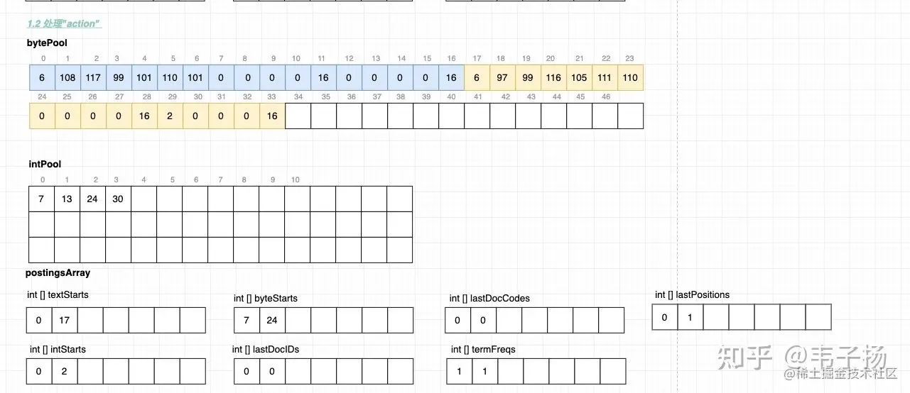 - postingArray的textStarts数组的第1位标记为17, 因为这个term是从bytePool的第17位开始写的;