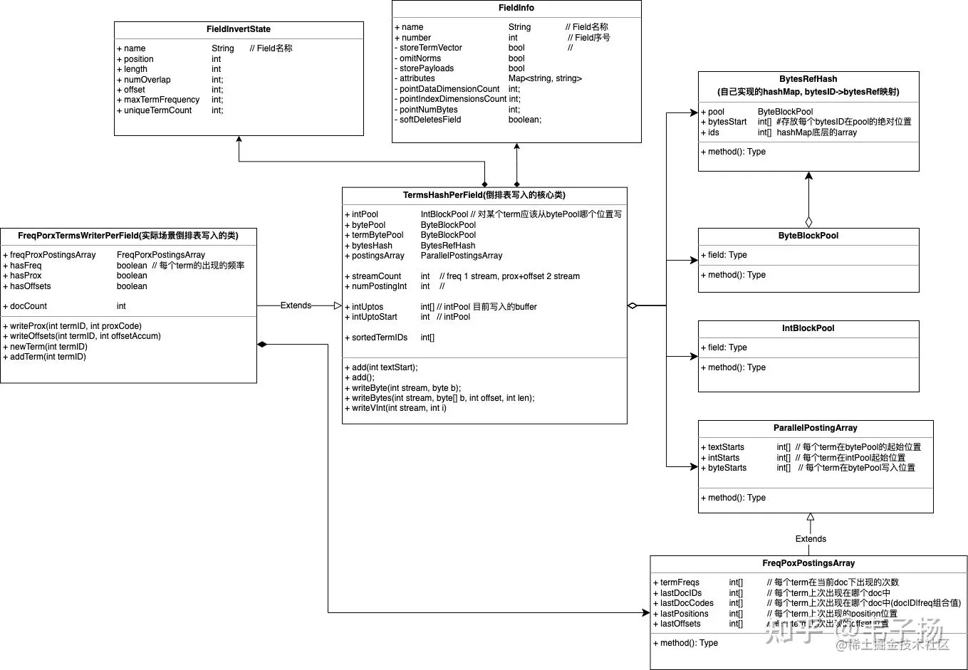 实际上,postingsArray的textStart, intStarts, byteStarts置位以后是不会原地更改的,而lastDocCodes, lastPositions,lastDocIDs, termFreqs这些属性是会当处理到下一个文档时而发生更改的,所以可以认为前三个属性是全局的,后四个属性是文档级别的。