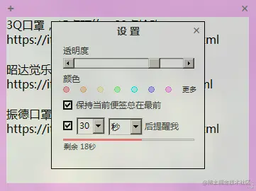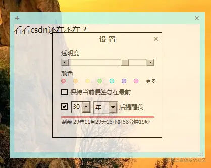 4.设置窗口置顶。双击便签顶部打开设置,勾选“便签最前”。此项仅对当前便签有效。