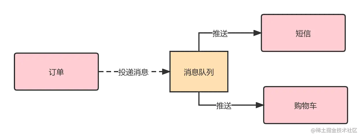 假设你做的电商的业务,下单后需要给用户发短信,需要移除购物车内的数据等等操作。按正常逻辑那就是在下单逻辑中调用购物车和短信服务的接口,那么此时就相当于直接依赖了短信和购物车。