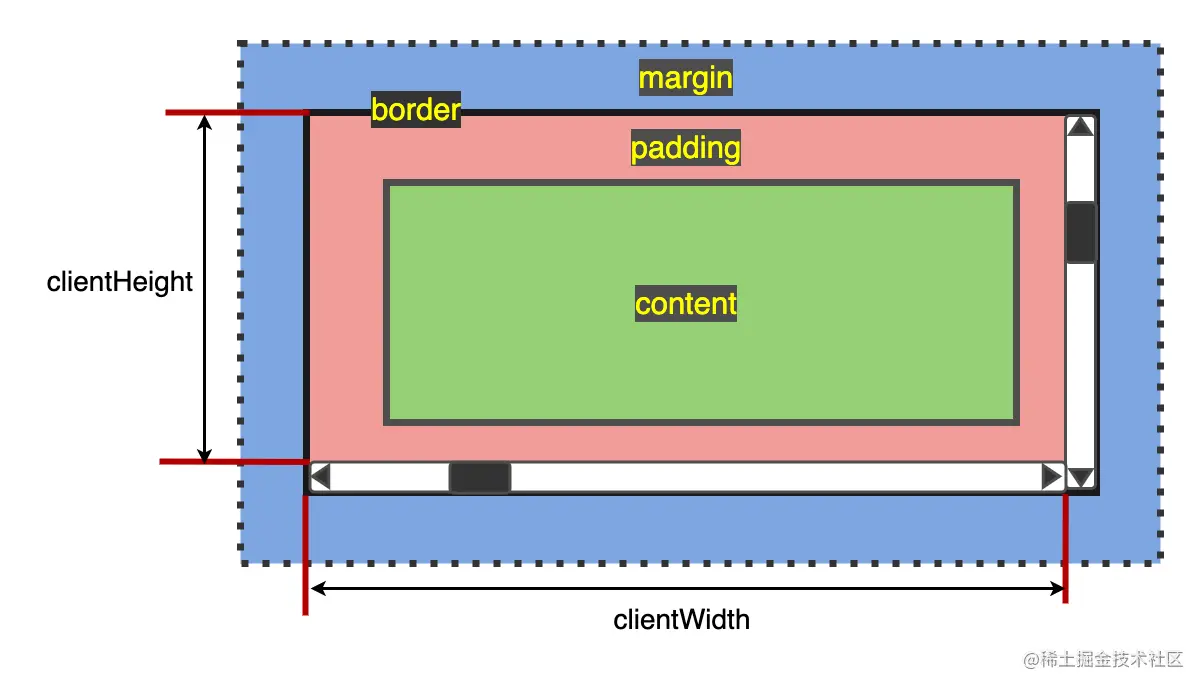 Element.clientWidth / Element.clientHeight分别返回元素的内部宽度和内部高度,包括内边距 padding,但不包括边框 border、外边距 margin、滚动条。