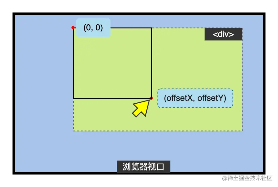 event.offsetX / event.offsetY返回鼠标点击处相对于当前鼠标事件触发的 dom 元素的坐标。不过左上角基准点在不同浏览器中有区别,IE 中以内容区左上角为基准点,不包括边框,如果触发点在边框上会返回负值;而chrome中以左上角边框处为基准点。
