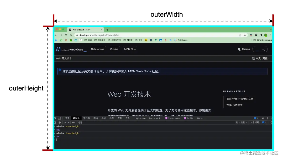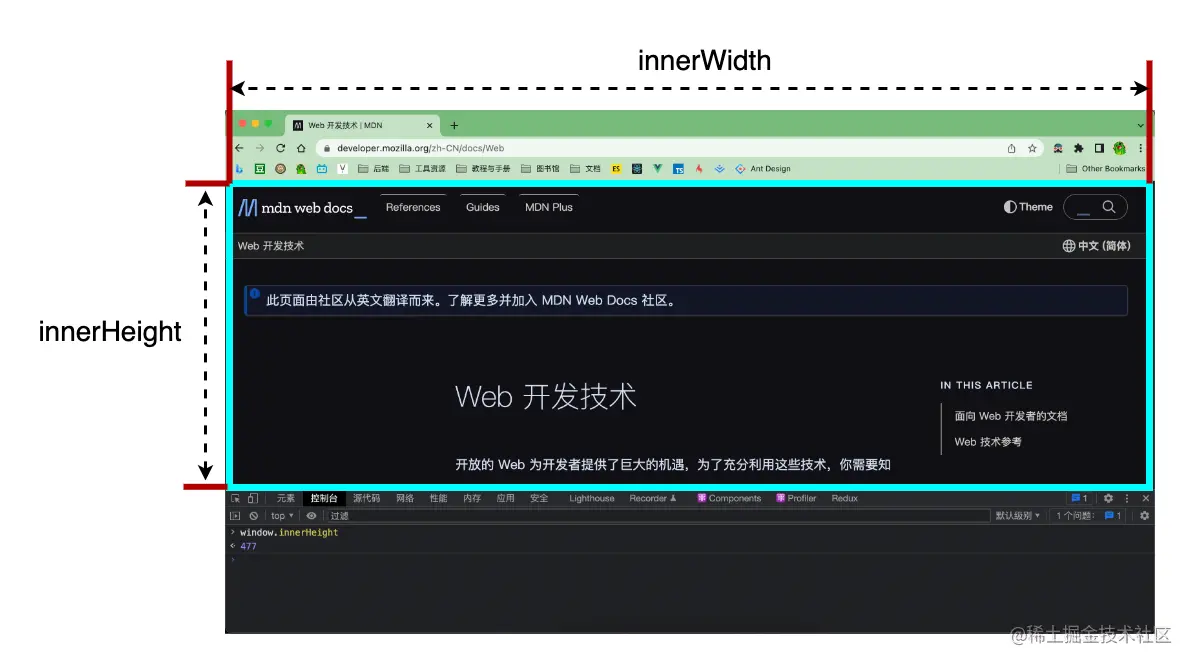 window.innerWidth / window.innerHeight 分别返回浏览器视口的内部宽度和内部高度,不包括控制台、浏览器工具栏的高度,如果存在滚动条,则包括滚动条的宽度或高度