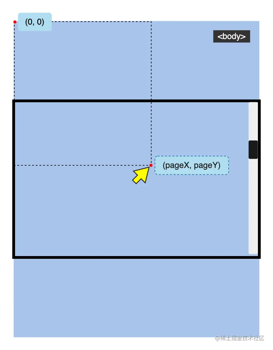 event.pageX / event.pageY返回鼠标点击处相对于当前文档( 元素)的坐标,会随着页面滚动而改变。