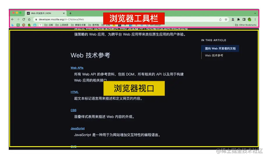 黄框的部分称“视口(viewport) ” 是我们关注的重点,通常我们在编写网页时都不需要指定网页的高度,只需要指定网页的宽度,这是因为网页可以在竖直方向上滚动,即使网页真的很长。而视口指的就是浏览器窗口中可见的视窗部分。