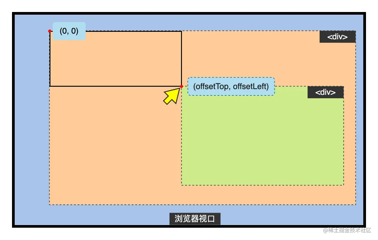 HTMLElement.offsetTop / HTMLElement.offsetLeft 为只读属性,分别返回当前元素相对于其 offsetParent 元素(直接父元素)的左上角内边距的距离。