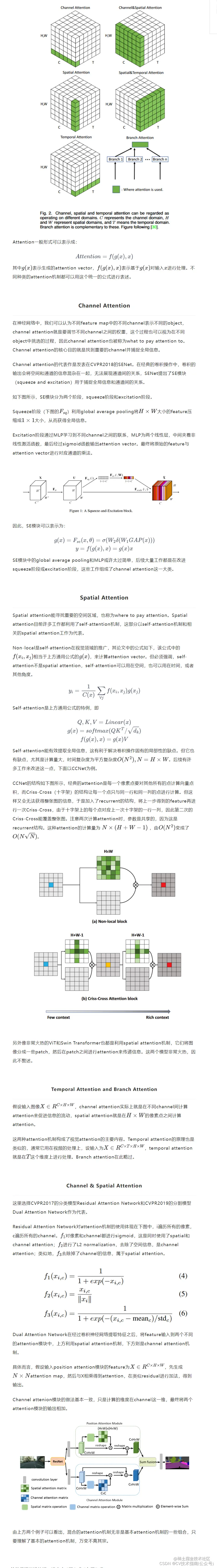 Attention机制目的在于聚焦有用的信息,并减少不重要信息的比重。Attention机制可以分为6大类,包括4个基础类别和2个组合类别。4个基础类别分别是通道注意力(channel attention),空间注意力(spatial attention),时间注意力(temporal attention),分支注意力(branch attention)。2个组合类别即通道与空间的组合,空间与时间的组合。