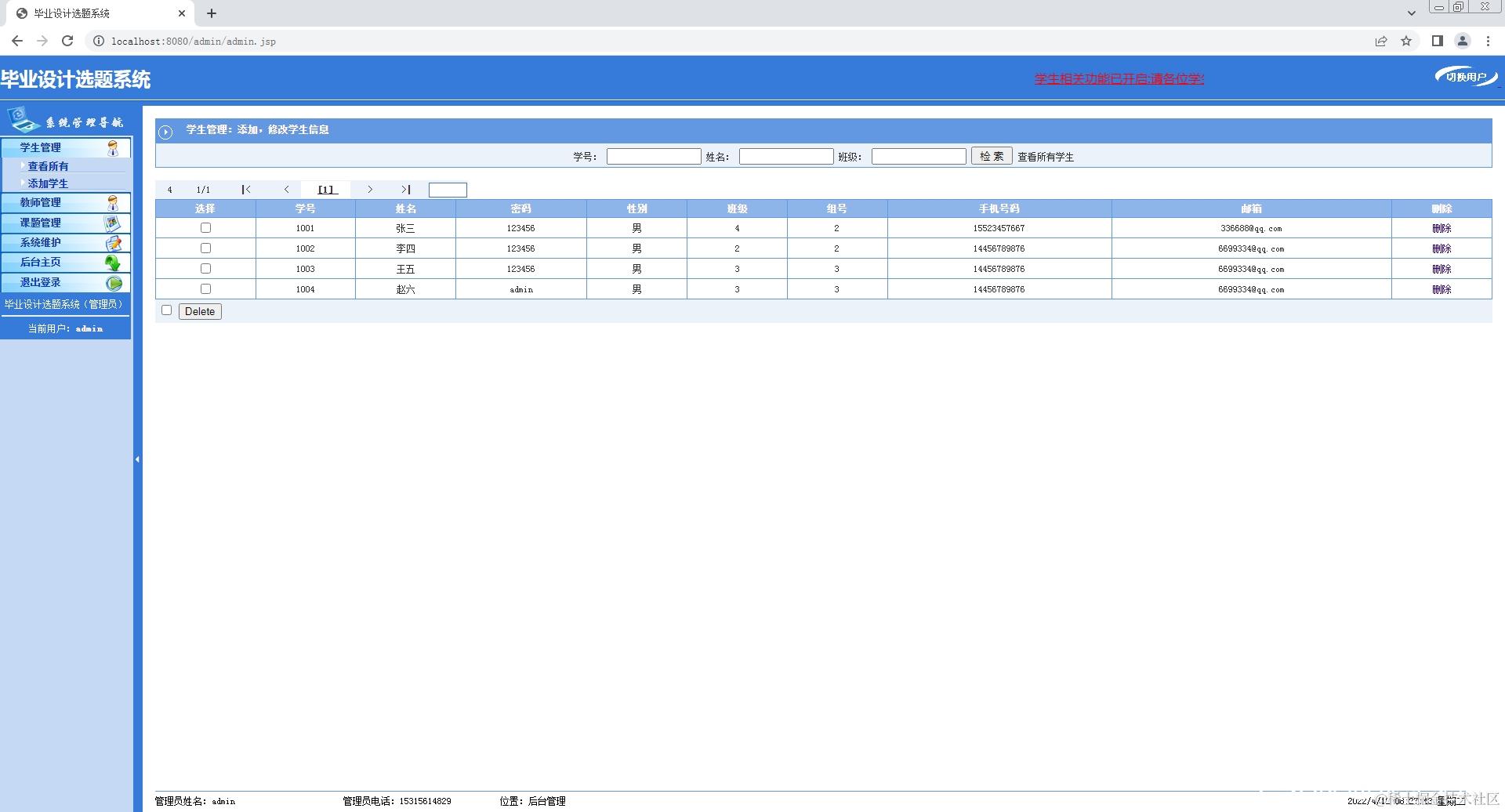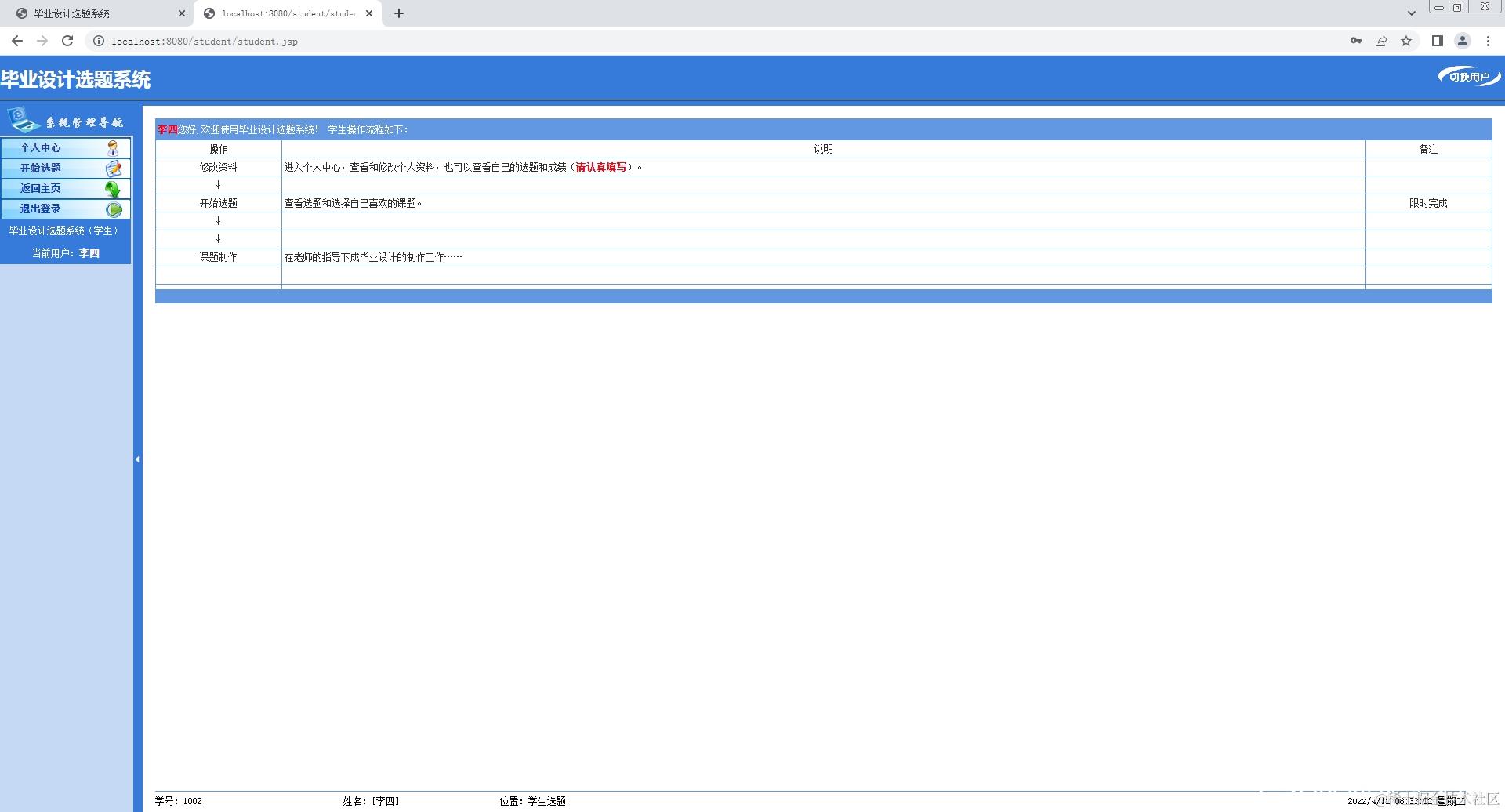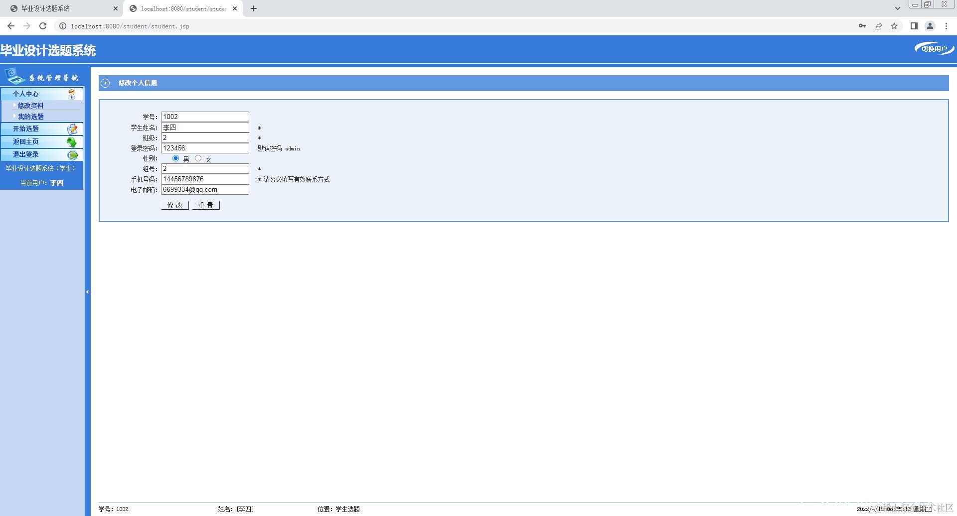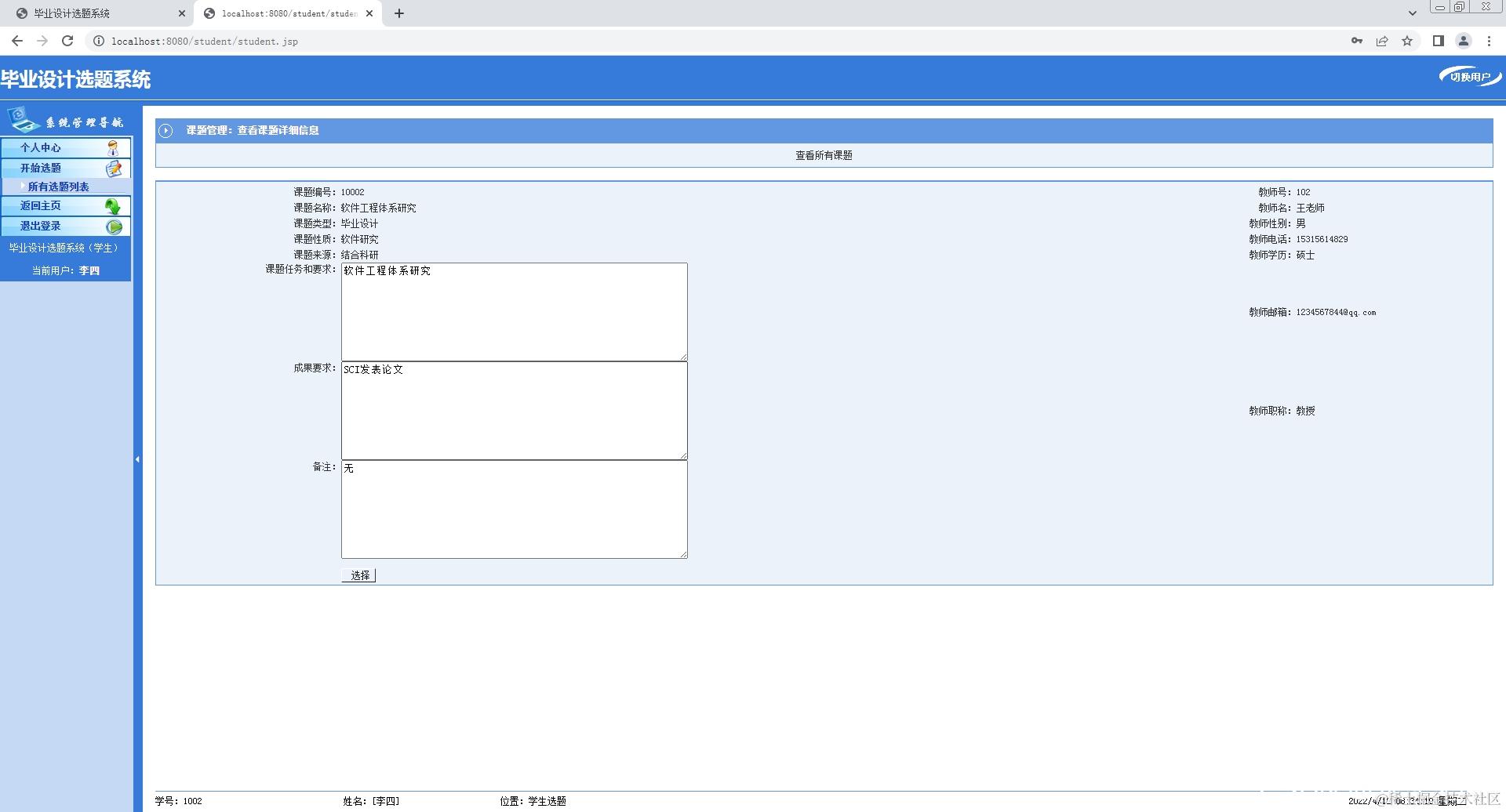 3.学生登录系统,修改个人信息,查看选题,选择课题;