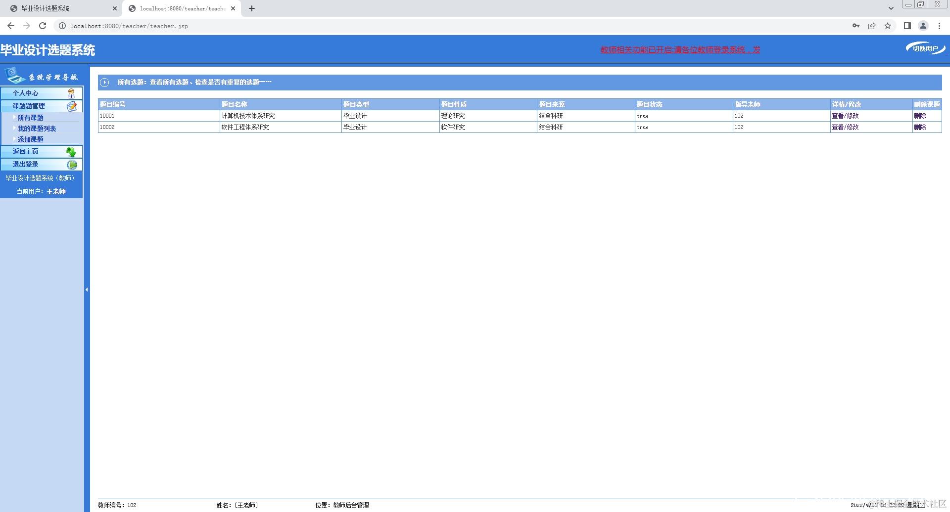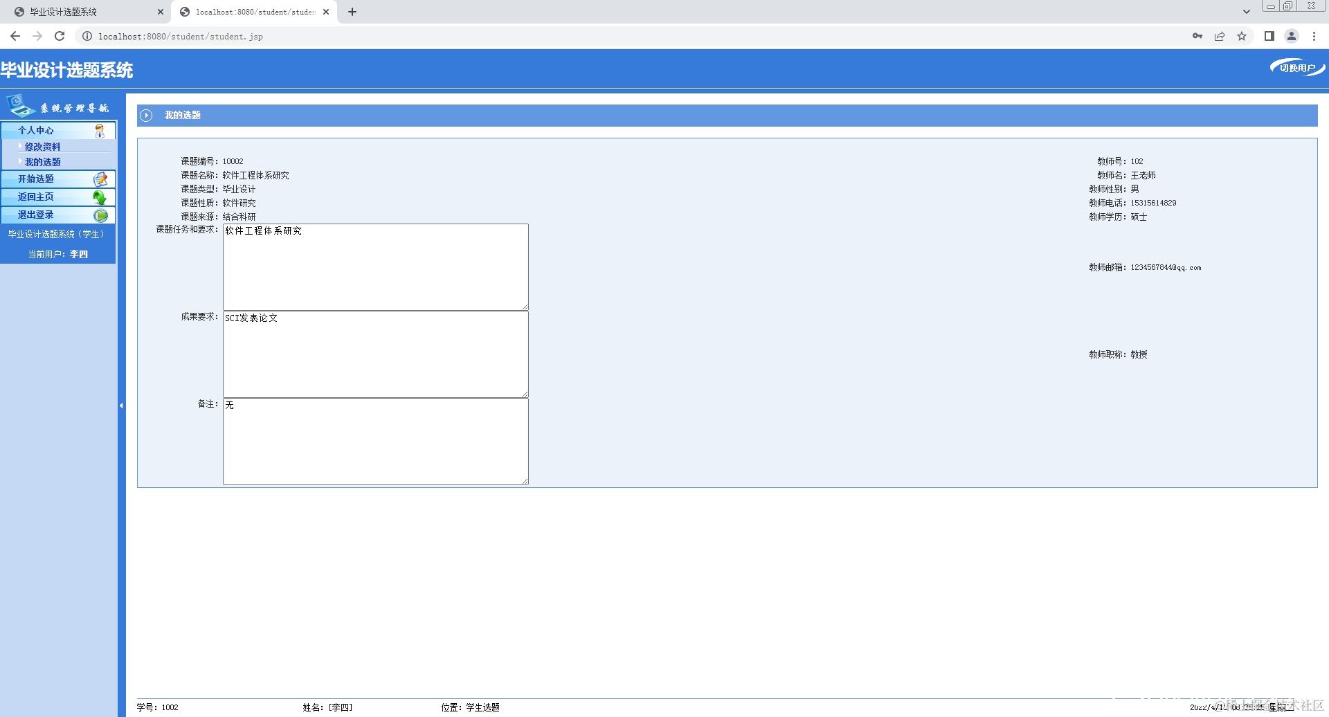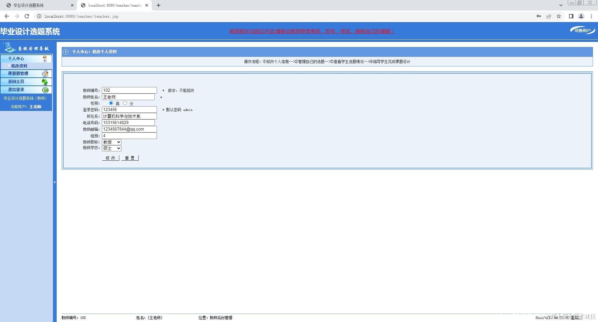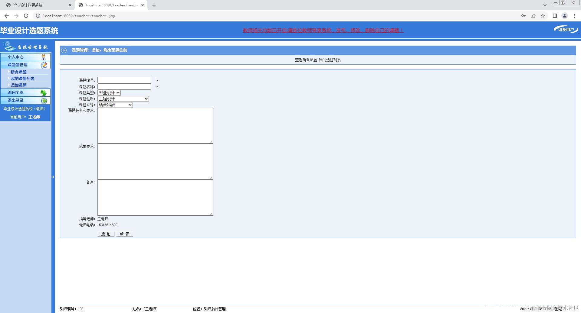 2.教师登录系统,修改个人信息,添加课题,查看课题;