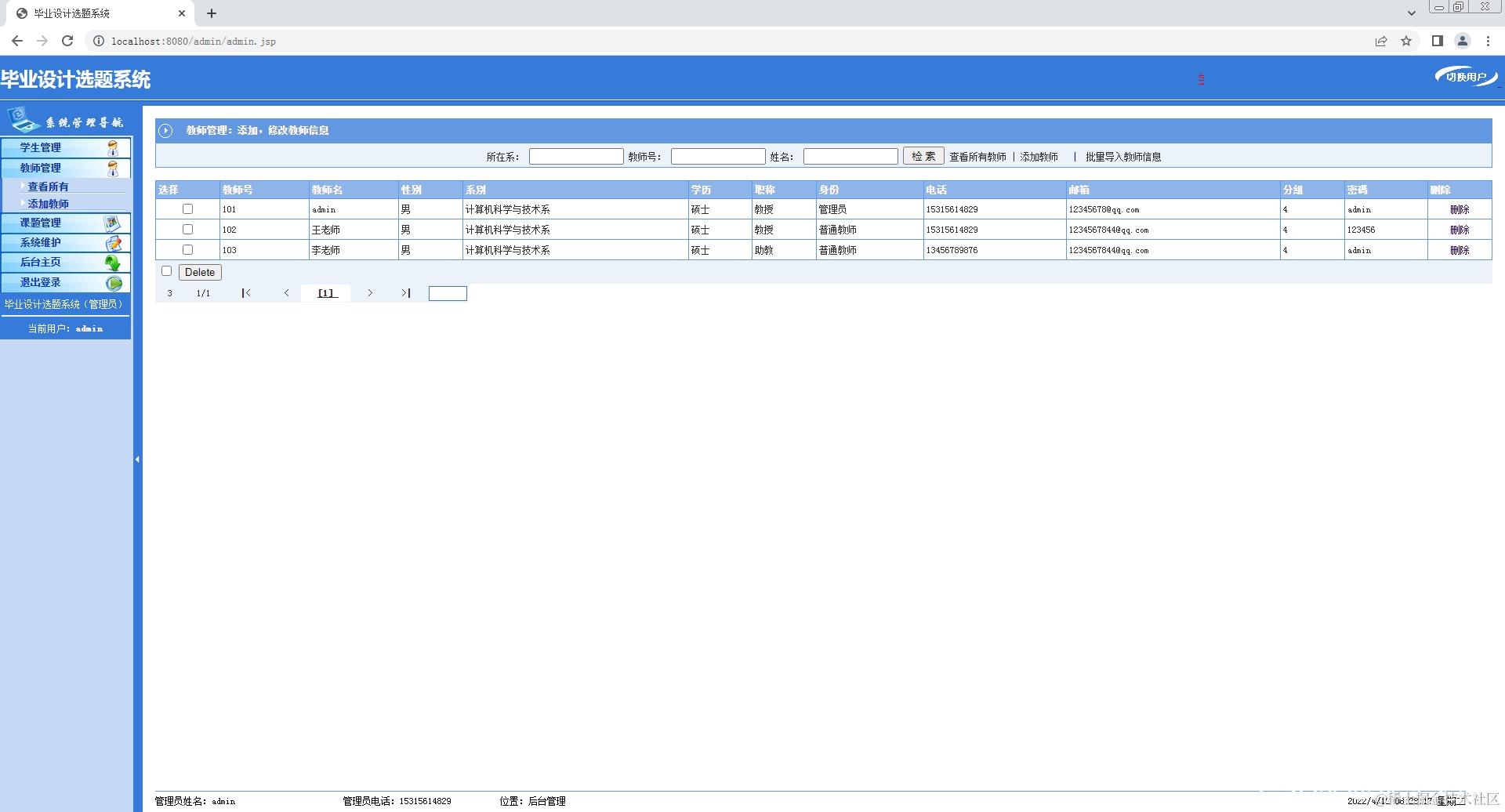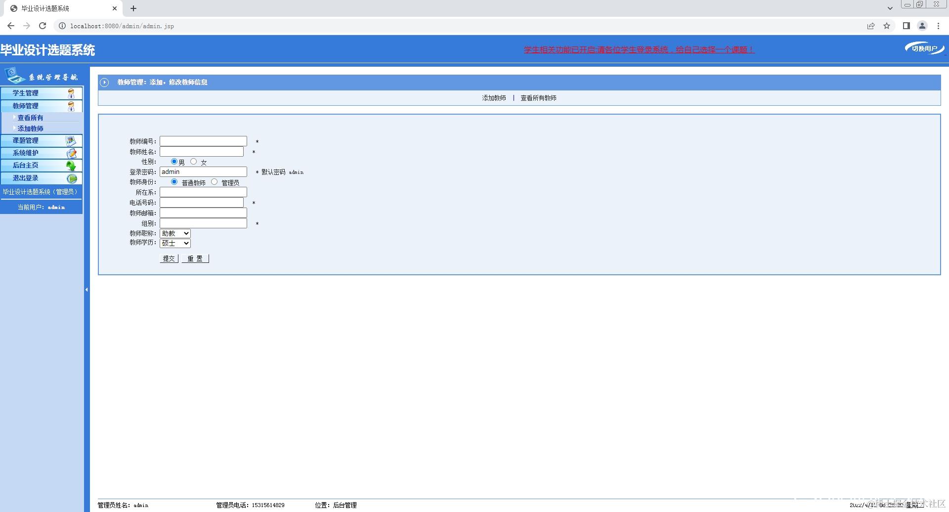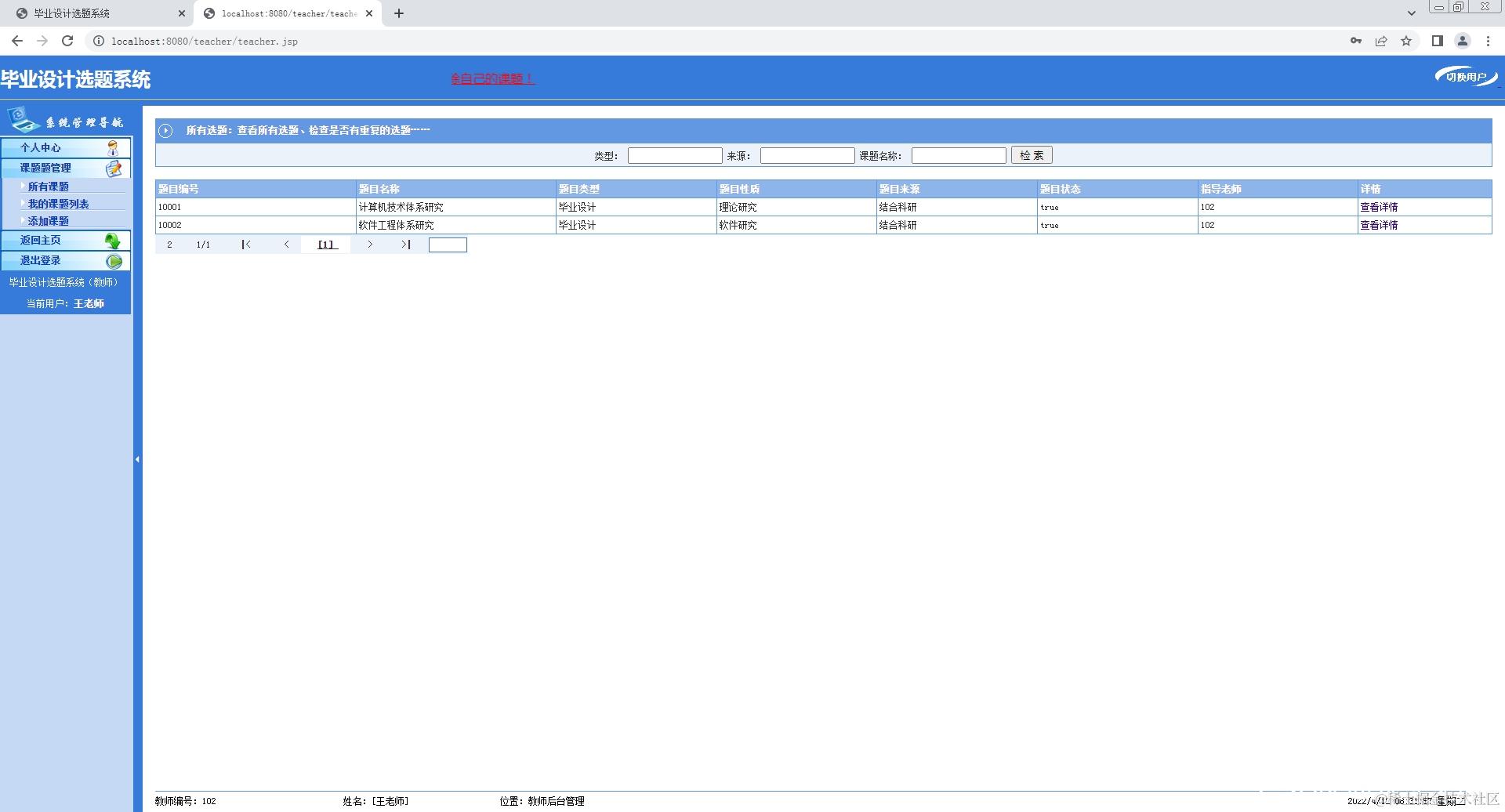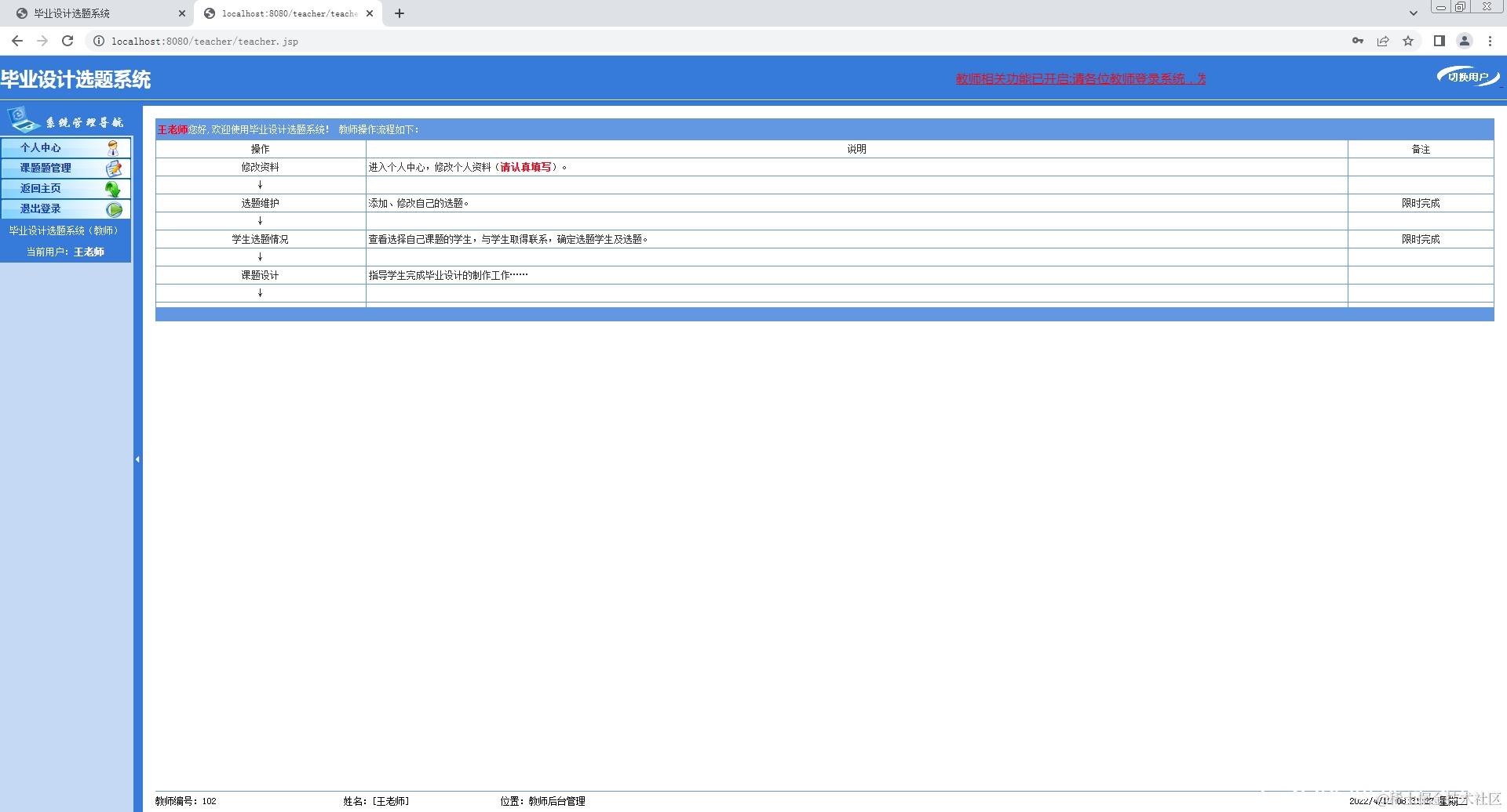 2.教师登录系统,修改个人信息,添加课题,查看课题;